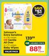 Johnson's Extra Sensitive 4 x 56 Wipes Or Gentle All Over 4 x 72 Wipes-Per Pack