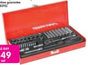 Set Includes: 14 Standard Sockets, 8 x Deep Sockets, 3 x Slotted Bits, 4 x Philips Bits, 5 x Hex Bits, 6 x Torx Bits, 2 x Bitholders, 1 x Ratchet, 1 x Spinner Handle, 1 x 40mm And 1 x 75mm Extension Bar, Universal Joint And 1 x Coupler, Lifetime Guarantee.