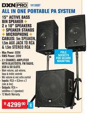 DXN 15" Active Bass Bin Speaker + 2X10" Speakers + Speaker Stands + Microphone + Cables